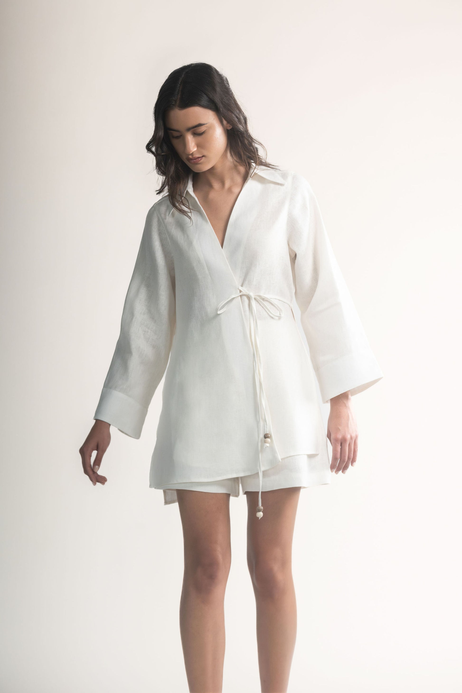 El cuello tipo camisa aporta definición, mientras que el lazo frontal permite graduar el ajuste a la cintura. Las puntas de las tiras llevan detalles en tagua que añaden un acento orgánico y característico de Ephedra. Las mangas amplias completan una silueta fluida y ligera.