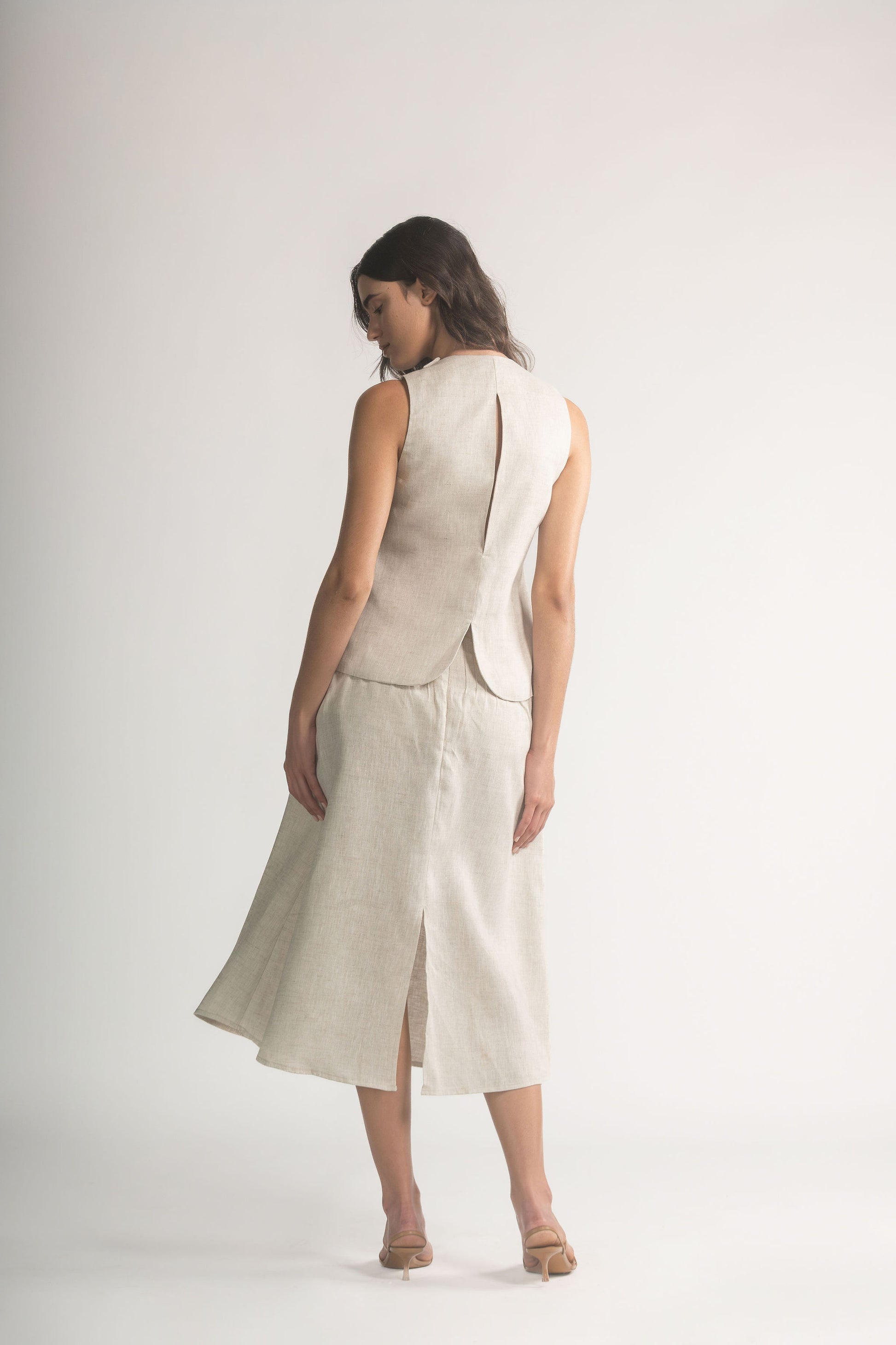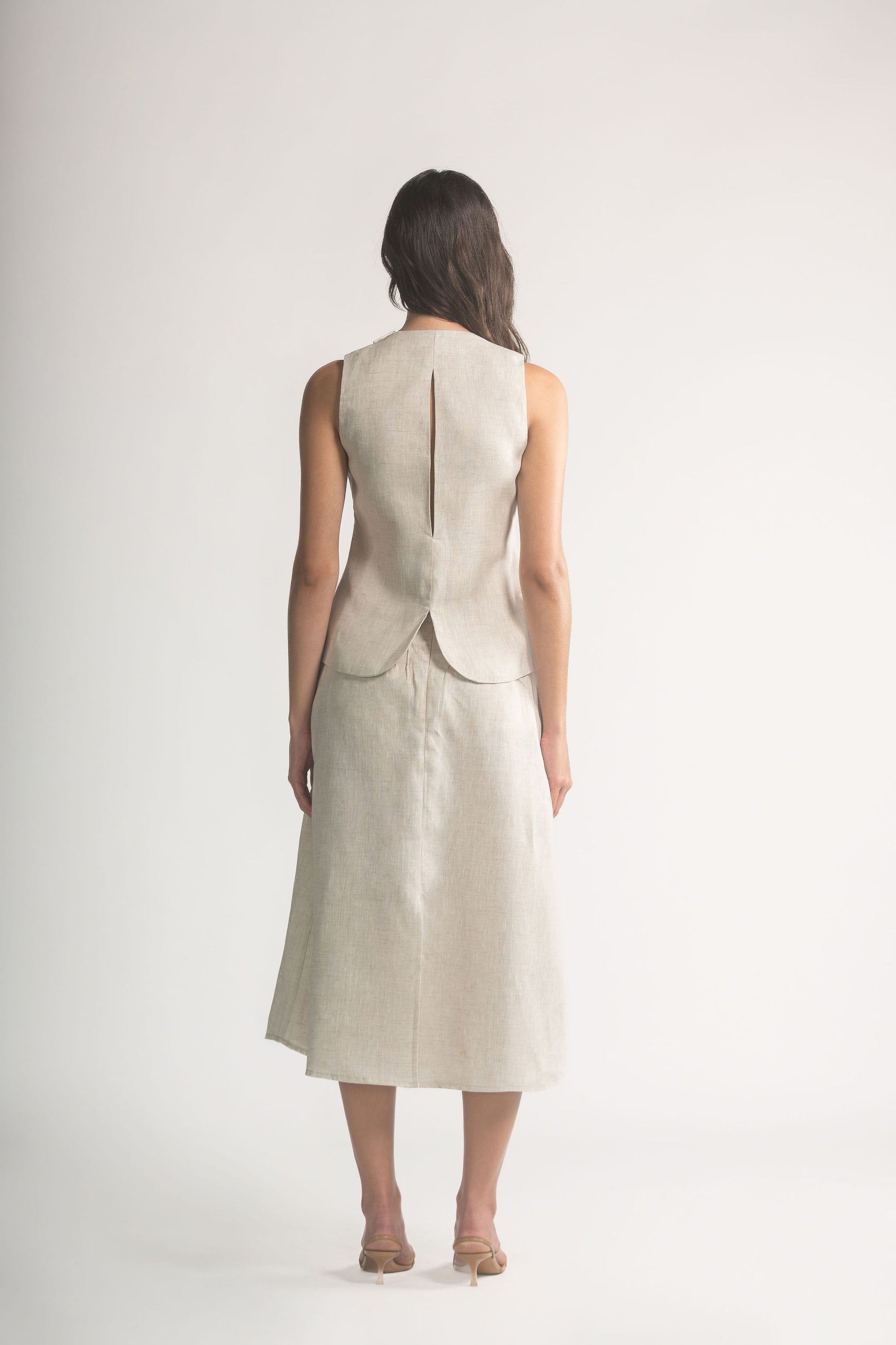 La caída es suave y amplia, permitiendo un movimiento natural en cada paso. Su largo midi aporta equilibrio y convierte esta pieza en un fondo de armario versátil, pensado para elevar composiciones monocromáticas o looks más ligeros.