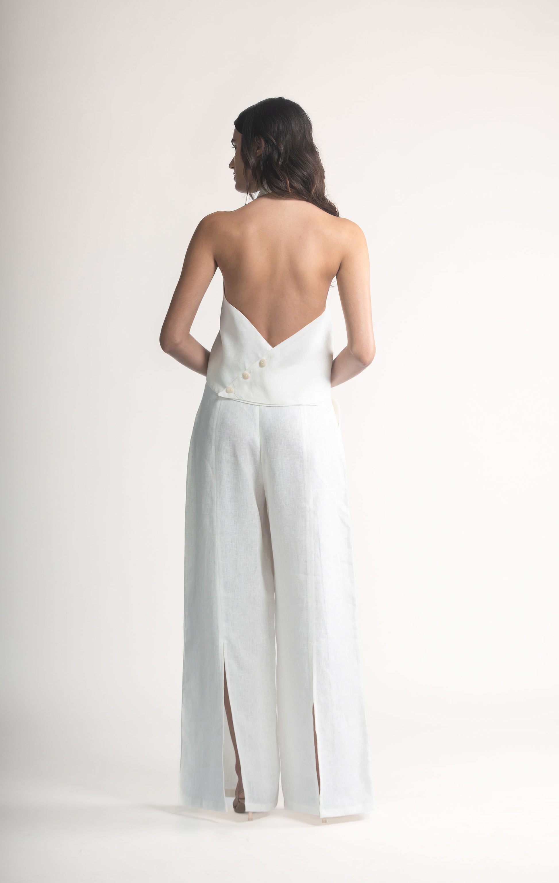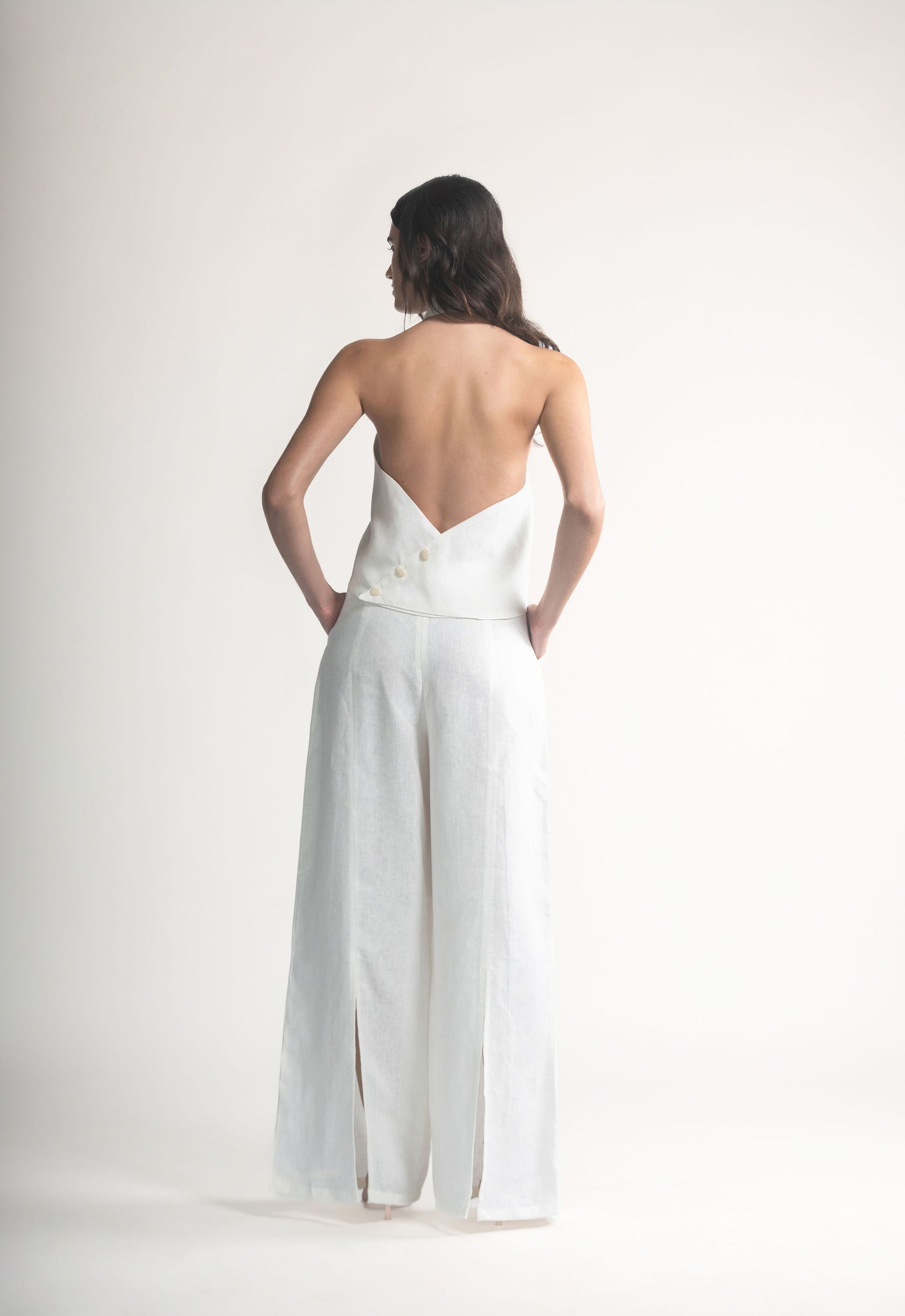 El Pantalón Alora se distingue por su tiro alto y una caída amplia que alarga la silueta con naturalidad.