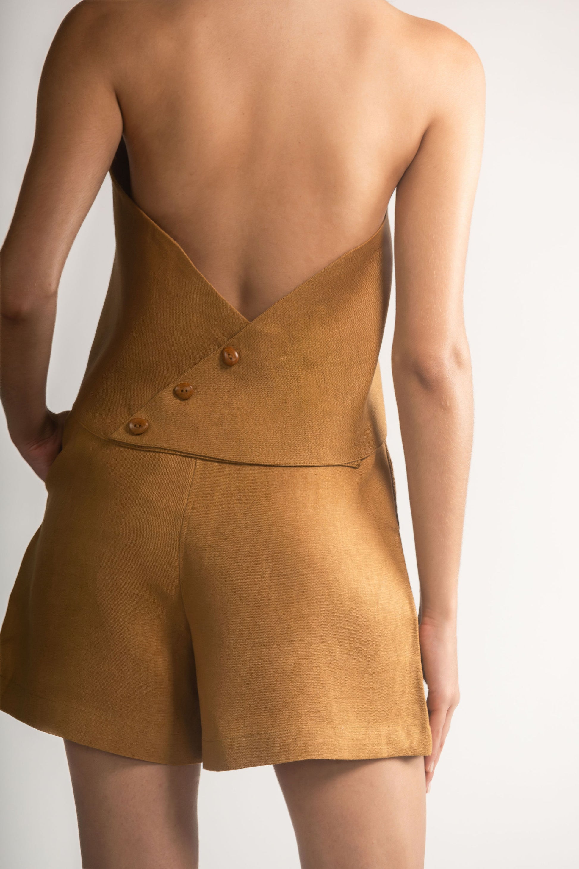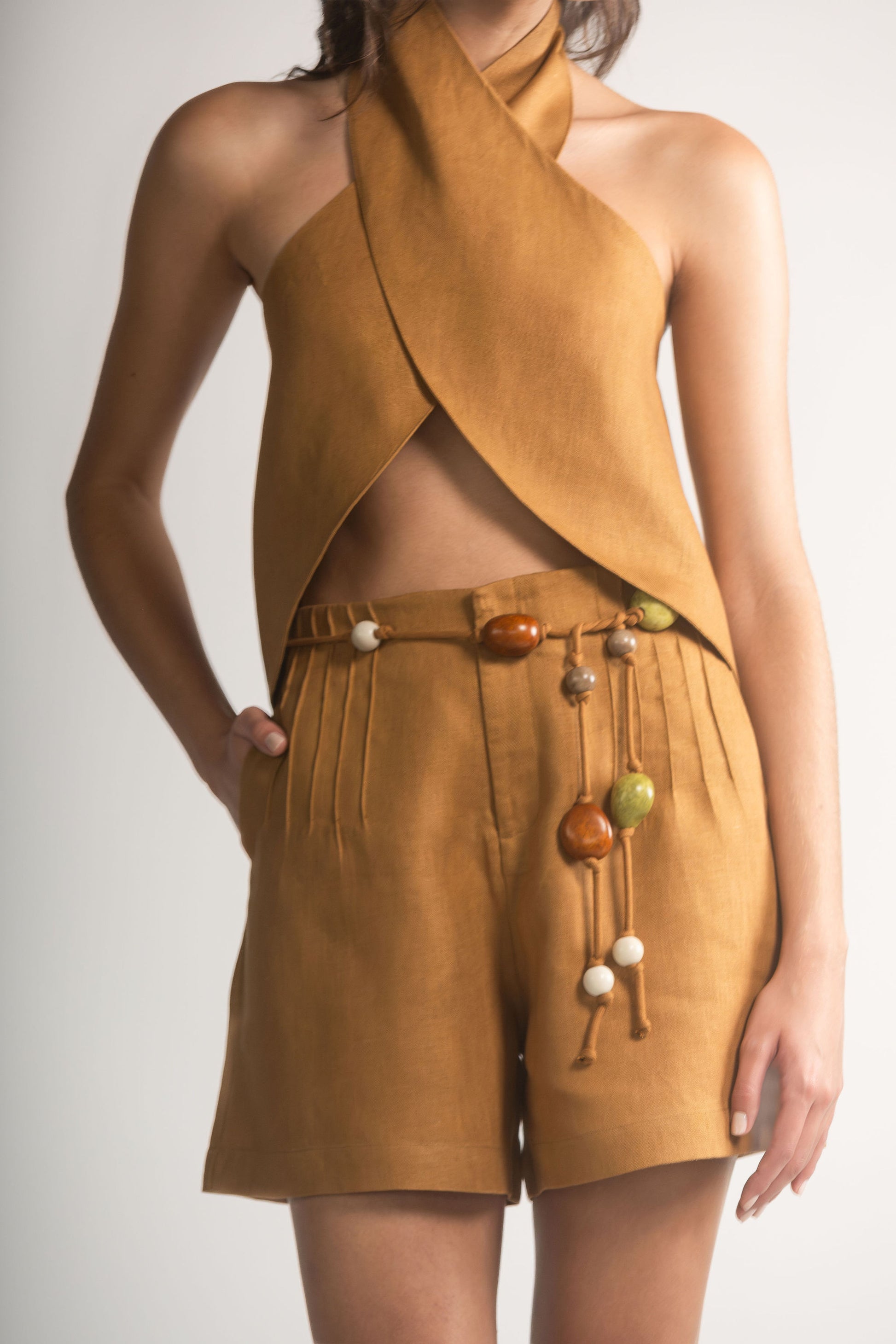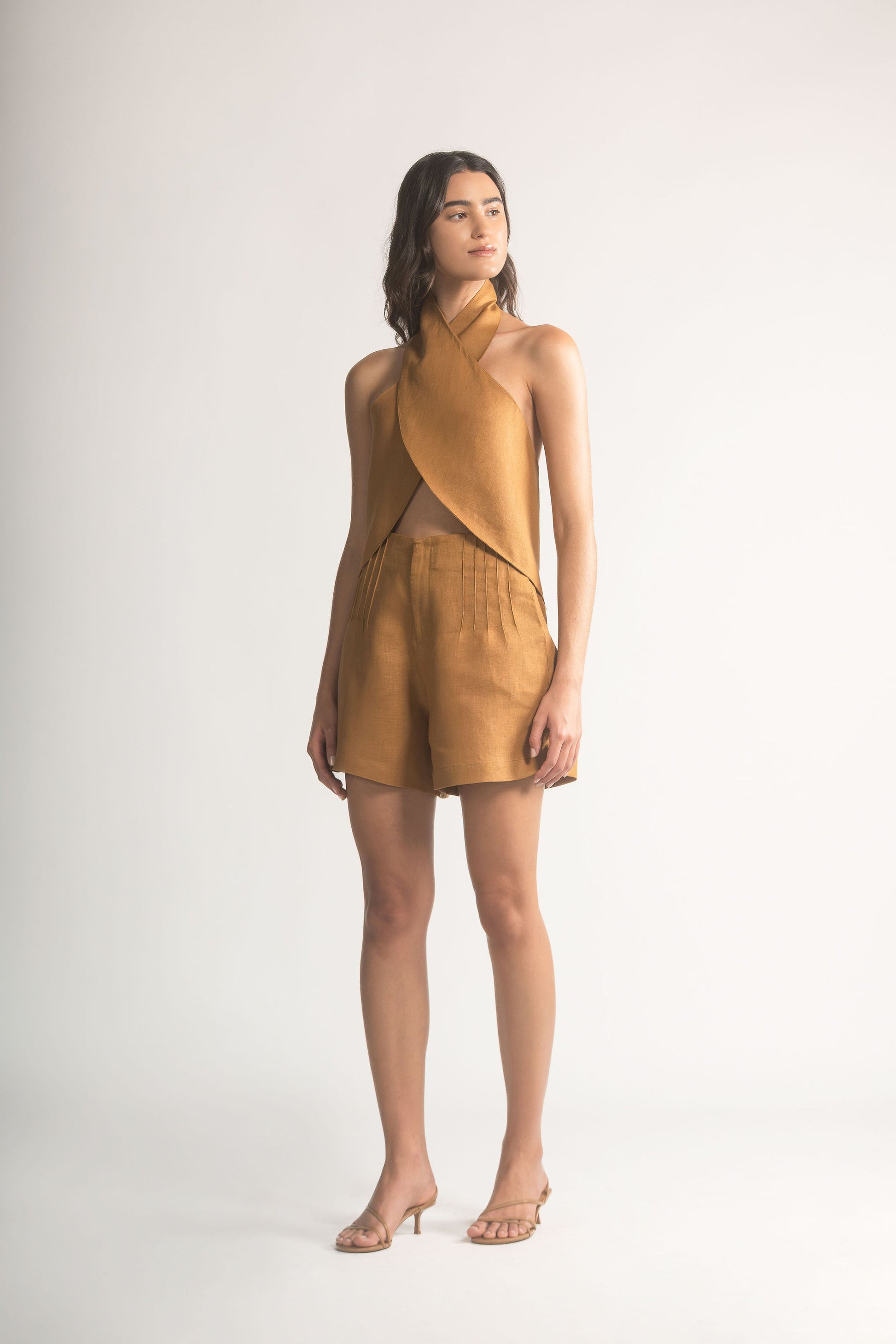 El Short Maya se define por su pretina en pliegues finos que enmarca la cintura con una construcción limpia.