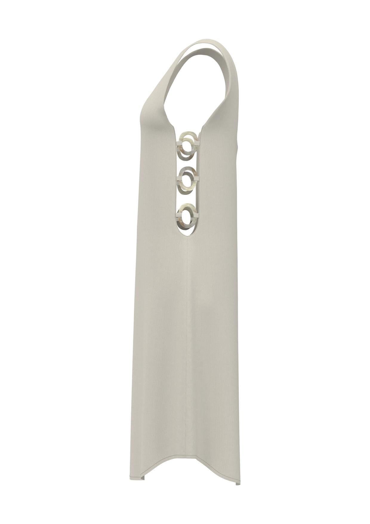 Un diseño fluido con tiras y aberturas laterales que añaden un detalle diferenciador. Los aros irregulares en Madre Perla destacan en la prenda, aportando un acabado único y artesanal. Ideal para quienes buscan una pieza especial con personalidad.